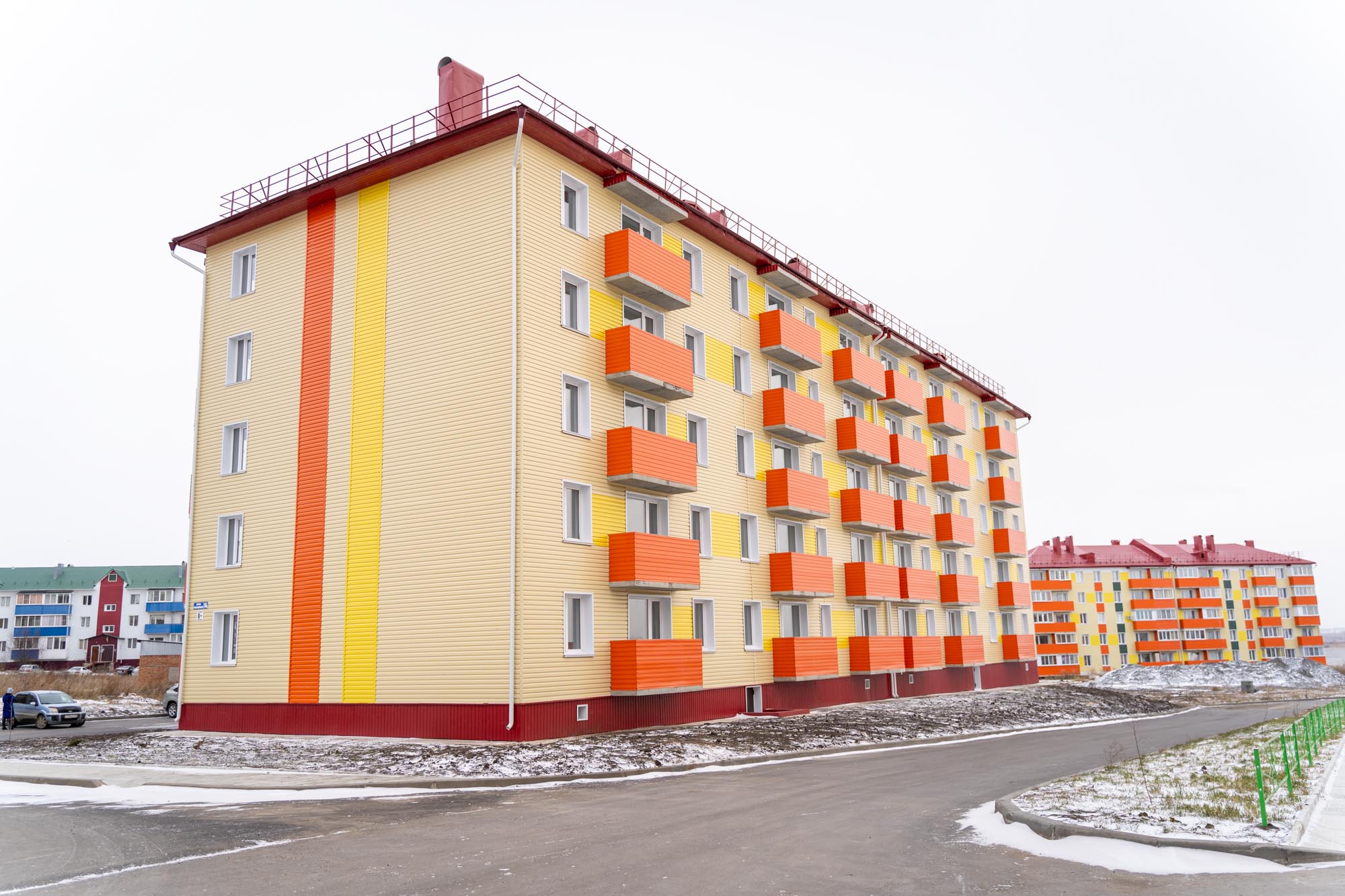 Рядом с новым домом находятся детский сад, школа, магазины и автобусная остановка, что создает комфортные условия для жизни. Прилегающая территория также была благоустроена: организованы парковочные места для автомобилей и оборудована детская площадка.