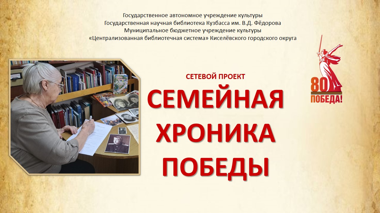 В преддверии 2025 года – года 80-летия Победы в Великой Отечественной войне библиотеки Киселёвска приглашают вас принять участие в проекте «Семейная хроника Победы». Вспомните историю своей семьи: перелистайте семейные альбомы, перечитайте военные треугольники, подержите в руках боевые награды, и поделитесь с нами частицей истории своих родных.