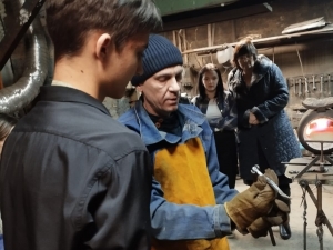 Мастер-класс состоялся на базе специализированной мастерской Евгения Егошина. Учащиеся Тяжинской средней школы № 1 имени Героя Кузбасса Николая Ивановича Масалова пообщались с мастером и его единомышленниками, продолжателями традиций кузнечного ремесла, чеканки и гравюры – Денисом Давыдовым и Александром Галямовым.