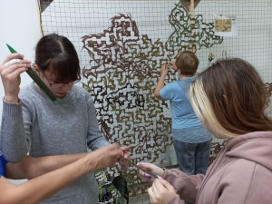 Предварительно преподаватель Галина Алексеевна Жогина, студенты второго курса группы Т-22 Анастасия Кузменко и Анжелика Мурашкина прошли обучение по вязанию маскировочных сетей в Кемеровском центре «Кузбасс.