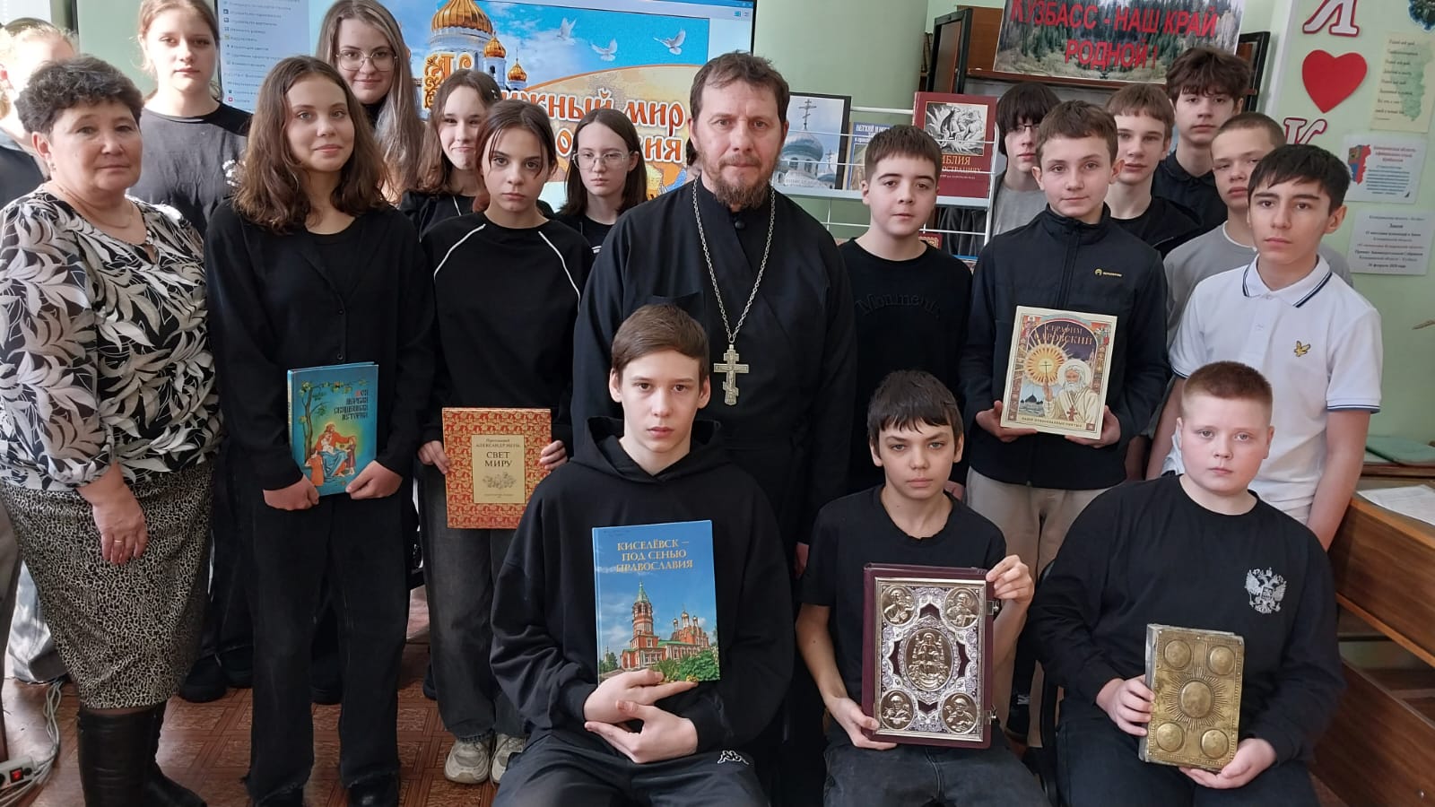 На встречу в библиотеку был приглашён иерей Андрей - священнослужитель Киселёвского благочиния. Священник рассказывал, что во всех церквях города есть книги, по которым проходят богослужения и показал ценную церковную книгу «Апостол», изданную в далёком 1834 году и новое издание «Апостола», выпущенное в XXI веке. Ребята подержали в руках, полистали православные книги на церковно-славянском языке и узнали историю происхождения выражения «красная строка», которая отчетливо видна в показанных книгах.