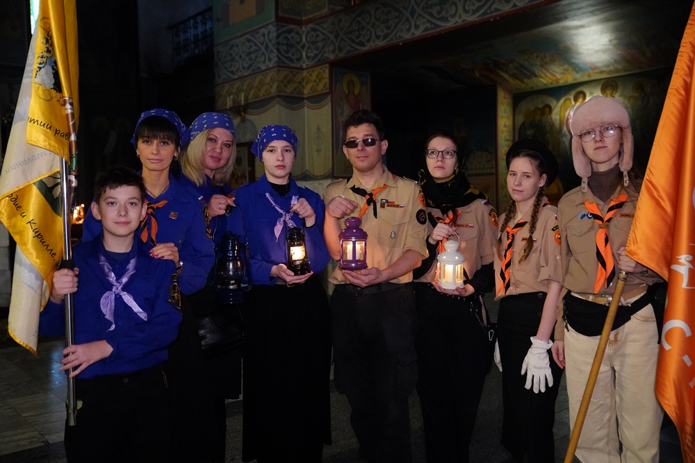 В честь прибытия Вифлеемского огня в Знаменском кафедральном соборе прошел молебен, на котором присутствовали ветераны СВО, представители отрядов Братства православных следопытов региона. Участники спецоперации напутствовали ребят на верное служение Отечеству и сохранение основ православной веры. Затем каждый мог зажечь от лампады свой огонек.